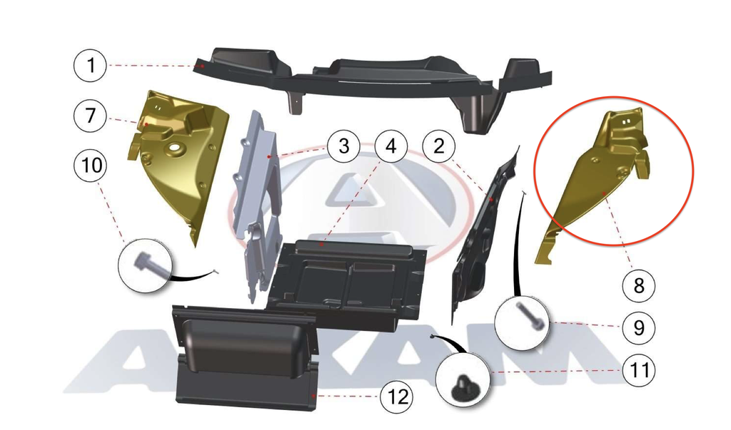 Innerskjerm venstre foran som passer til Aixam mopedbiler. Se bilde nedenfor for produktets plassering (nummer 8). Passer til følgende modeller: